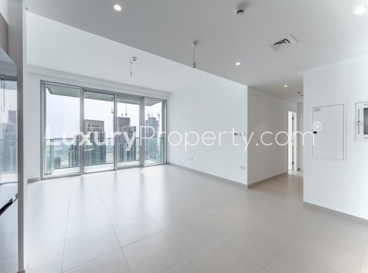 The apartment is offered unfurnished, allowing residents to personalize the space. It features a modern design with clean finishes and floor-to-ceiling windows.