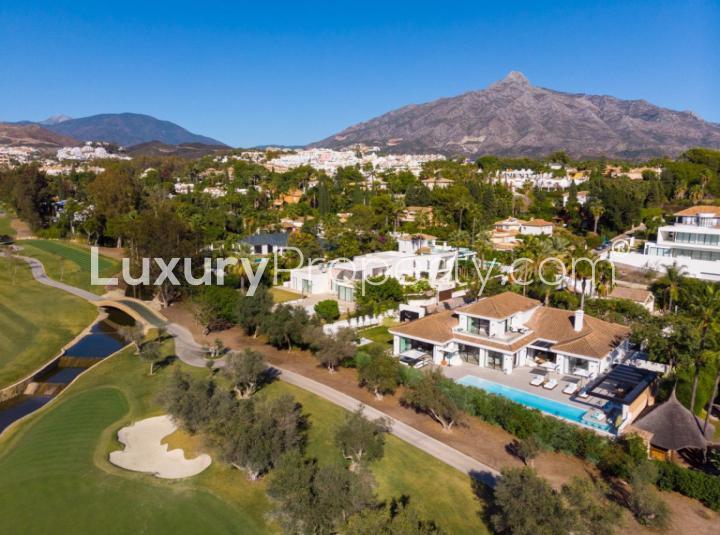 Some homes just make you slow your step as soon as you walk through the front door. This five bedroom villa in Las Brisas, Nueva Andalucía, really got me doing that. For a minute you almost forget you are just here for a viewing. Maybe it is the way the morning light fills the whole place or the quiet you notice even with Marbella's life just close by. The golf course views steal some attention too. Honestly you could stand by the window for ages and just watch the golfers or listen to the breeze moving through the trees. There is something about being right on the frontline of Las Brisas Golf Course. You really feel it at every level of this villa. The sight lines are wide open and uninterrupted. And it is not just a quick glimpse, you get these rolling greens and tall palms out there all day.