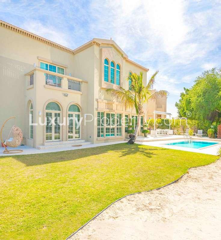 The villa itself has been thoughtfully upgraded by the current owners and, honestly, it shows everywhere you look. It sits on a especially large plot which means your garden feels a bit more private than most. I actually spent a minute just standing by the glass doors looking out at the pool and the backyard and thinking this is definitely more than just a simple lawn. You have your own in ground pool for swimming or just floating on a hot afternoon. There is a shaded space tucked away for outdoor dining and I noticed a volleyball net at the corner. Even a private piece of sandy beach which is not something you see often in Jumeirah Islands.