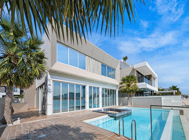 Some homes just invite you to slow down before you even reach the front door. That is exactly how it felt to pull up to this five bedroom villa on Frond N of Palm Jumeirah. You notice right away that the house sits on a really spacious plot. The landscaping is already green and soft underfoot and the marina skyline feels almost close enough to touch. And it is quiet in a gentle way. In a lot of villas on Palm Jumeirah the sound just feels different. Here you hear a bit of the waves and maybe the wind, if you listen for it.