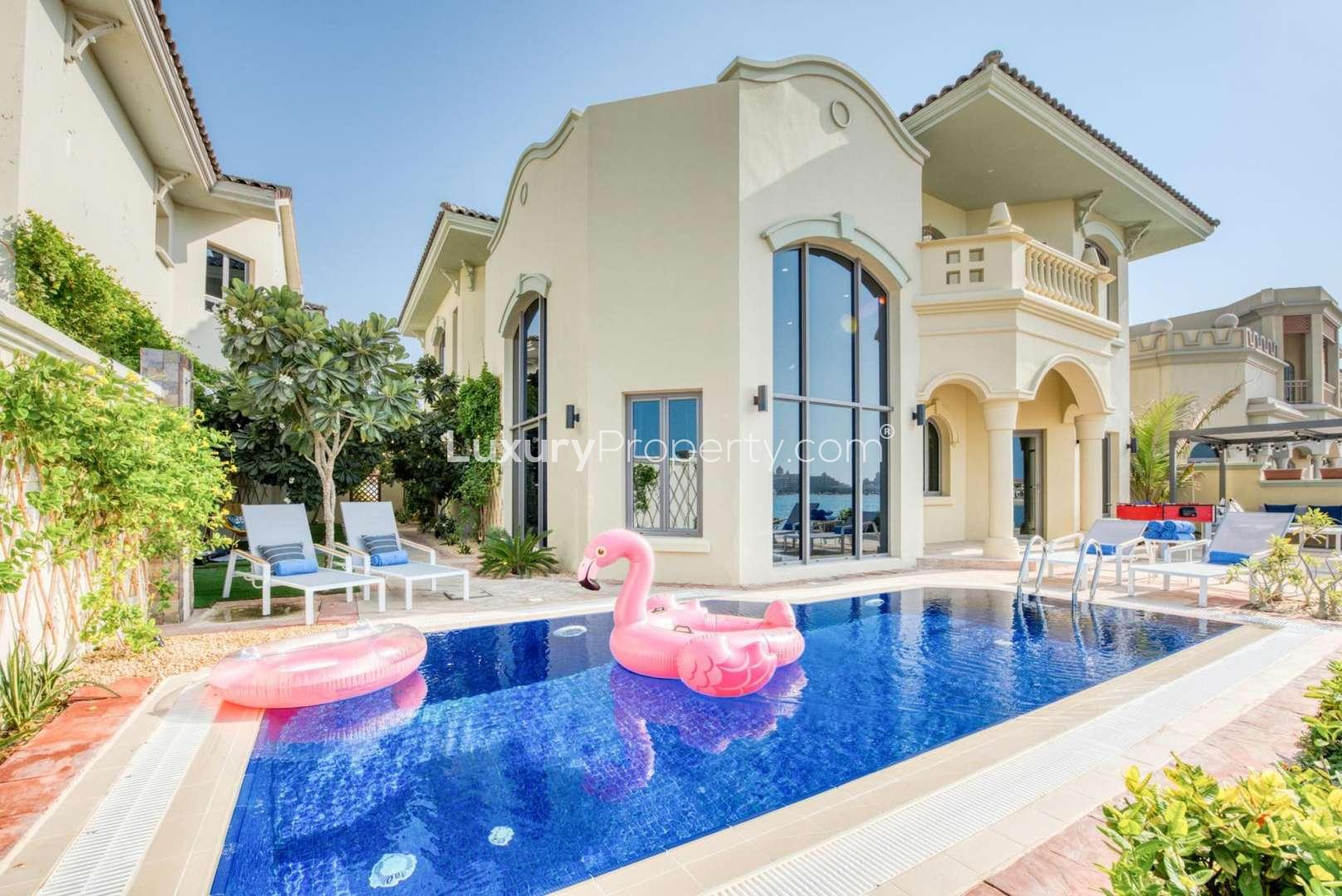 The design here leans into a Mediterranean vibe, but then you catch little pieces of Arabesque details tucked in the corners or along the arches. The villa uses bright colours, and the sun really streams in thanks to all these big windows; it does something nice for your mood, even on those few gloomy Dubai days. You can stand in the main living room and see out over the sea. Some mornings I have watched the early light come in and hit the water from one of the first floor balconies. The whole place just feels kind of peaceful but not at all cold.