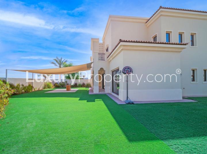 Some homes just make you pause at the doorway. This five bedroom villa in Lila at Arabian Ranches 2 really has that effect. First thing you notice is how open everything feels and there's just all this light that comes pouring in through the big living room windows. It is on a single row so you do not get that boxed in feeling. Instead you get a real sense of space the way the villa sits on one of the bigger plots here. I found myself just walking out into the back garden and it is huge honestly. You can picture weekends with kids running around or maybe an easy barbecue in the cooler months. Even with a place this big, it just feels easy.
