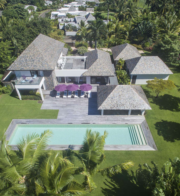 Step outside from the living space and there is even more wood underfoot on the patio. That part is especially nice in the mornings when you might want to stand outside with a coffee and just listen to the breeze. Late afternoons here get that slow, gentle feeling that sometimes makes you forget your phone for a while. The private pool outside catches the sun perfectly. The pool is bigger than you expect, great for swimming some lazy laps or just floating around. There is a gazebo in the garden, and honestly, I ended up sitting there longer than I meant to, just hearing the sound of the garden and birds. The garden really is something. It is set across a plot large enough that you could wander for a while and keep discovering new corners. There is more than enough space for kids to run around or for friends and family to enjoy an easy Sunday match on the petanque court. From almost everywhere, you get these glimpses of the Anahita golf course, plus that classic view of the lagoon with Ile Aux Cerfs drifting in the background. Early in the mornings, everything is misty and soft, then brightens so you can head outside for a swim or just relax in the sun.