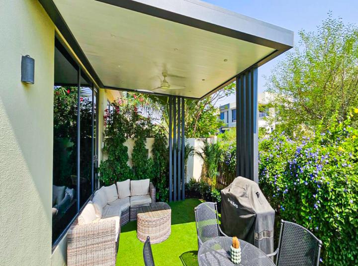 Outside, the backyard feels bigger than most villas you will see in Maple at Dubai Hills Estate, honestly. With just over three thousand square feet on the plot, you get privacy and room for kids or pets or just letting the grass grow a little wild if you feel like taking a break from landscaping. The community here is one of those rare places that feels both lively and peaceful at the same time. The pool and park are just around a two minute stroll away from your front door, so you might hear kids riding bikes in the evening or families gathering at the playground just close enough to feel connected but not so close that it ever gets noisy. Plus, being along that quiet greenbelt, there is no direct neighbour behind you. More calm, more space, a bit of a green view for those days when you want to just look out and see something real.