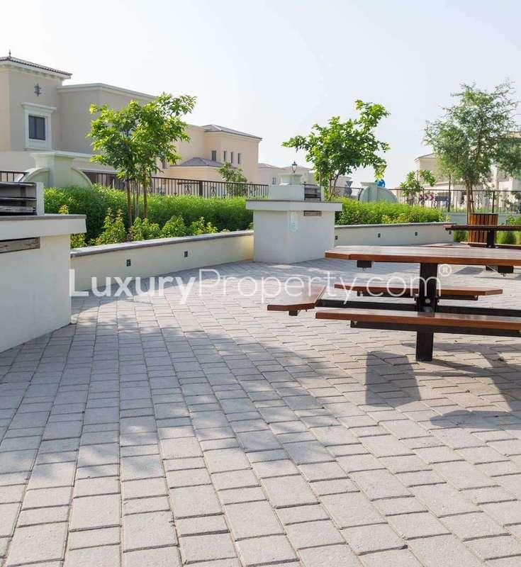 The garden space with this villa is the sort of area people actually spend time in. Good size for hosting a weekend barbecue or just lying back with a coffee listening to how quiet it can get sometimes. You could set up a swing grow some herbs for your cooking or just let the kids and pets run around. Parking is honestly a breeze which is not always the case in Dubai and you will find the neighbors actually wave when you pass. That sense of community still lives here.
