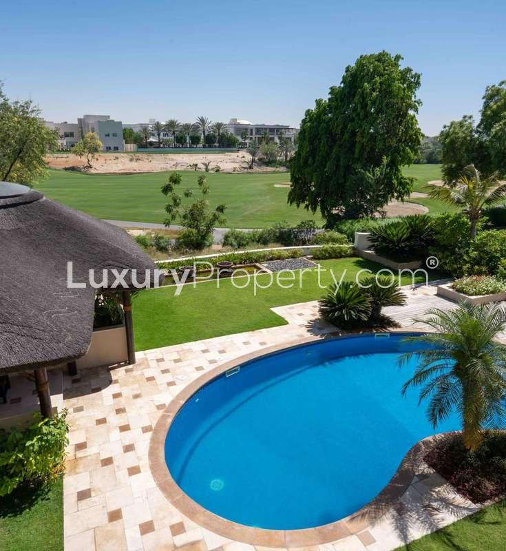 Some houses just have a calm about them. The sort of calm that makes you stand a little quiet inside the entryway for a minute. This five bedroom villa in Sector R of Emirates Hills, honestly, is one of those places. The first thing is the view, which is just straight golf course right through clean wide windows—nothing interrupting it. You do not see rooftops or walls, just green and sky and sunlight, and sometimes early in the mornings you can even spot a few birds drifting above the fairways or golfers moving along in the distance. It sort of pulls the outside into the house in a gentle way.