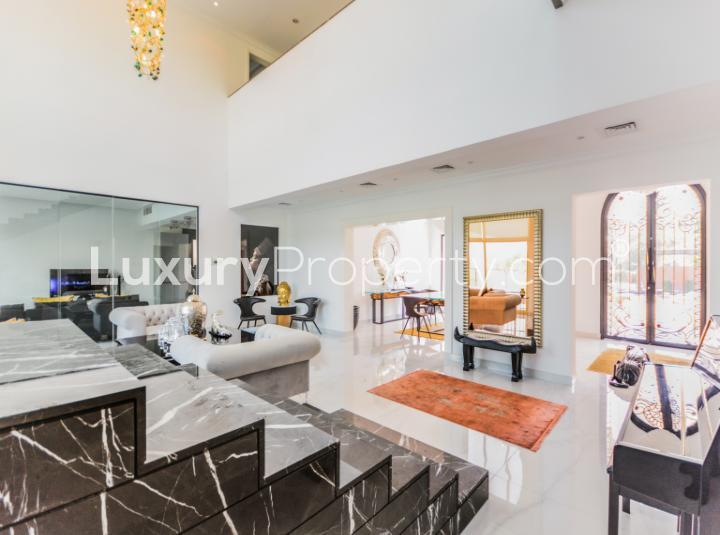Now the kitchen here is actually pretty lovely if you like to cook or even if you just want a good cup of coffee in the morning. The designer touches are there but nothing too over the top. It feels like a place you would really make a meal, not just heat something up. I could see people having long chats over dinner in the dining room because the living areas just flow together, naturally. It is all a bit bigger than you expect too. The built up area is a lot, over five thousand square feet, and the plot itself is huge for Dubai, more than ten thousand square feet. When you walk through you can feel that extra space. It does something to your mood, or at least it did for me.
