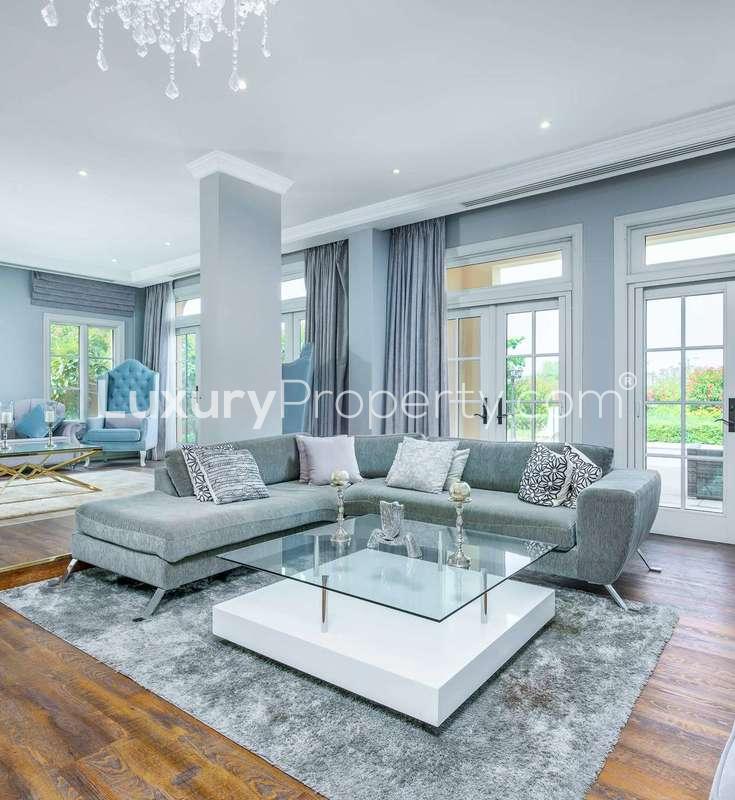 The villa itself gives you space to breathe. There is just over eight thousand square feet of built up area so you never feel crowded even with guests around. The living room is the place people will gather I think. It stretches out with light pouring in through big windows. There is this fireplace too and while you may not need it much in Dubai its presence just makes the room feel like somewhere you want to spend hours with a book or having late conversations. Some homes feel stiff but that is not the case here. You can imagine kids stumbling in from the pool and just collapsing on the couch.