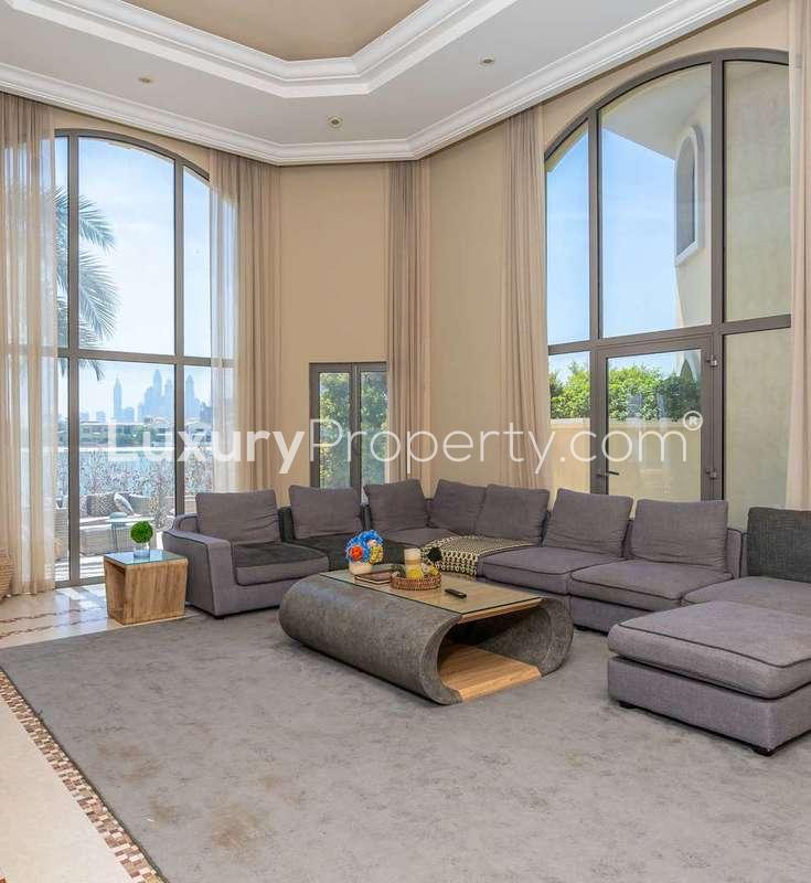 Some homes have this quiet magic—it just sort of greets you when you come through the door. Walking into this four bedroom villa in Garden Homes, Palm Jebel Ali, I actually paused for a second and noticed how it just feels easy. Light everywhere, nothing really trying too hard—just a sense of calm that settles in as you look out at the water and the skyline in the distance. That view really is something. You can stand by these huge windows in the living room and see the city stretching out past the sea. Even in the middle of the day you still get these gentle flashes off the water.