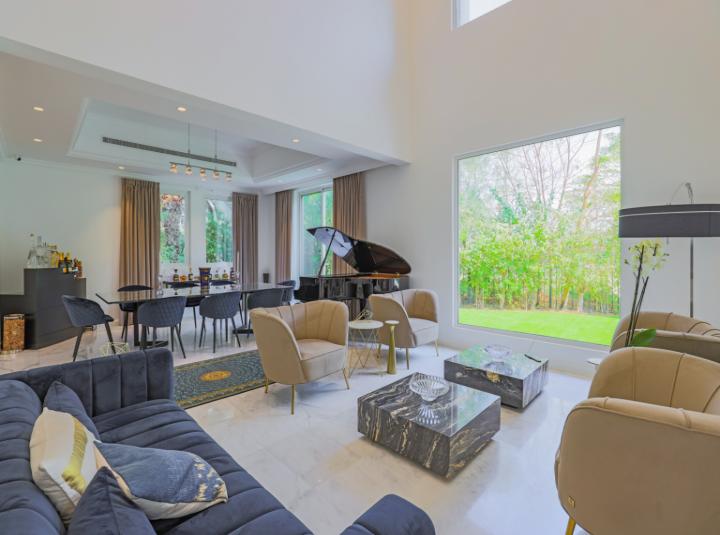 Inside these villas in Jumeirah Islands always bring a bit of the Mediterranean to Dubai and it shows in the way the light bounces off the marble floors. I spent some time in the living room and those floor to ceiling windows do make you want to pause. The space feels open without being empty and the feeling in here is more home than house. The layout flows into the dining area and then wraps into the kitchen. If you actually like to cook you will probably appreciate what they have done here. Proper Bosch appliances and a marble countertop that is made for family breakfasts or those long talks over a cup of coffee. The kitchen just feels ready for real life. Not too fancy to use. Just easy.