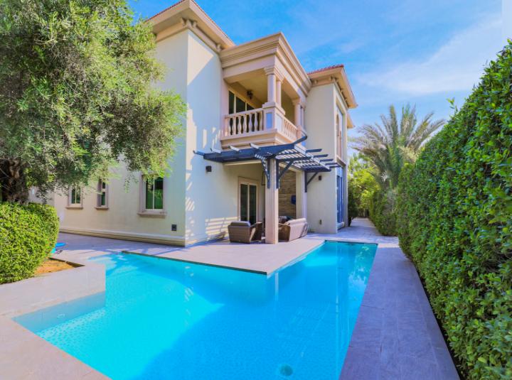 The villa really does sit in one of the loveliest spots in Jumeirah Islands. The garden faces the lake and you can see the water from almost every corner downstairs. I noticed the trees rustling outside and kept hearing birds now and then. You get lots of privacy too. It is just you and that green garden and your own extended swimming pool which has been upgraded. There is even a little area to just pull up a chair by the pool and dip your feet in. That bit is pretty great in the evenings. Sometimes you will hear families laughing at the clubhouse next door. Honestly it feels a bit like summer all year long here.