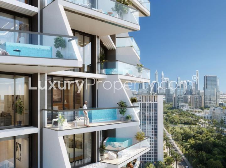 Binghatti Grove features a dedicated amenity level, Swimming Pools, Fitness Facilities, Wellness Zones, Sports Courts