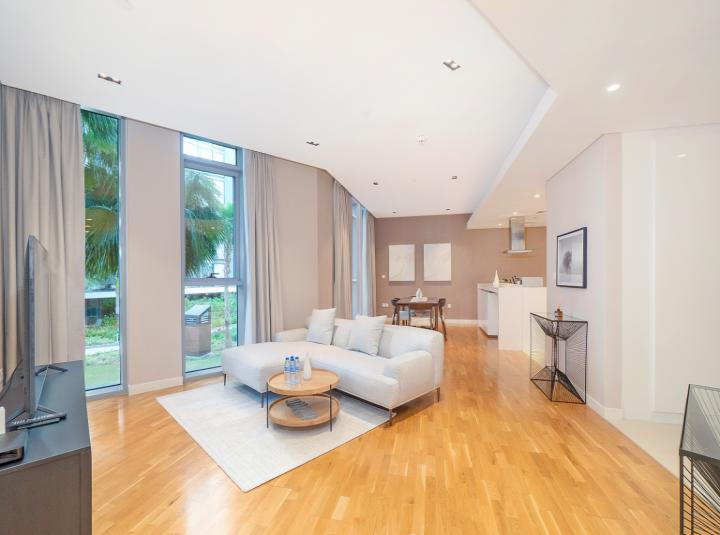 First off this place gives you space to move. One bedroom apartments in Dubai can sometimes feel cramped but here you really notice the difference in the layout. The living room actually feels like one where you can stretch out. The way the kitchen is set up means you can actually cook, not just microwave leftovers. I ran my hand along the white stone and you can tell someone thought about details like that. All the appliances are proper, not just for show, and honestly the cabinets are the kind you want to fill up with your groceries and mugs instead of hiding stuff.