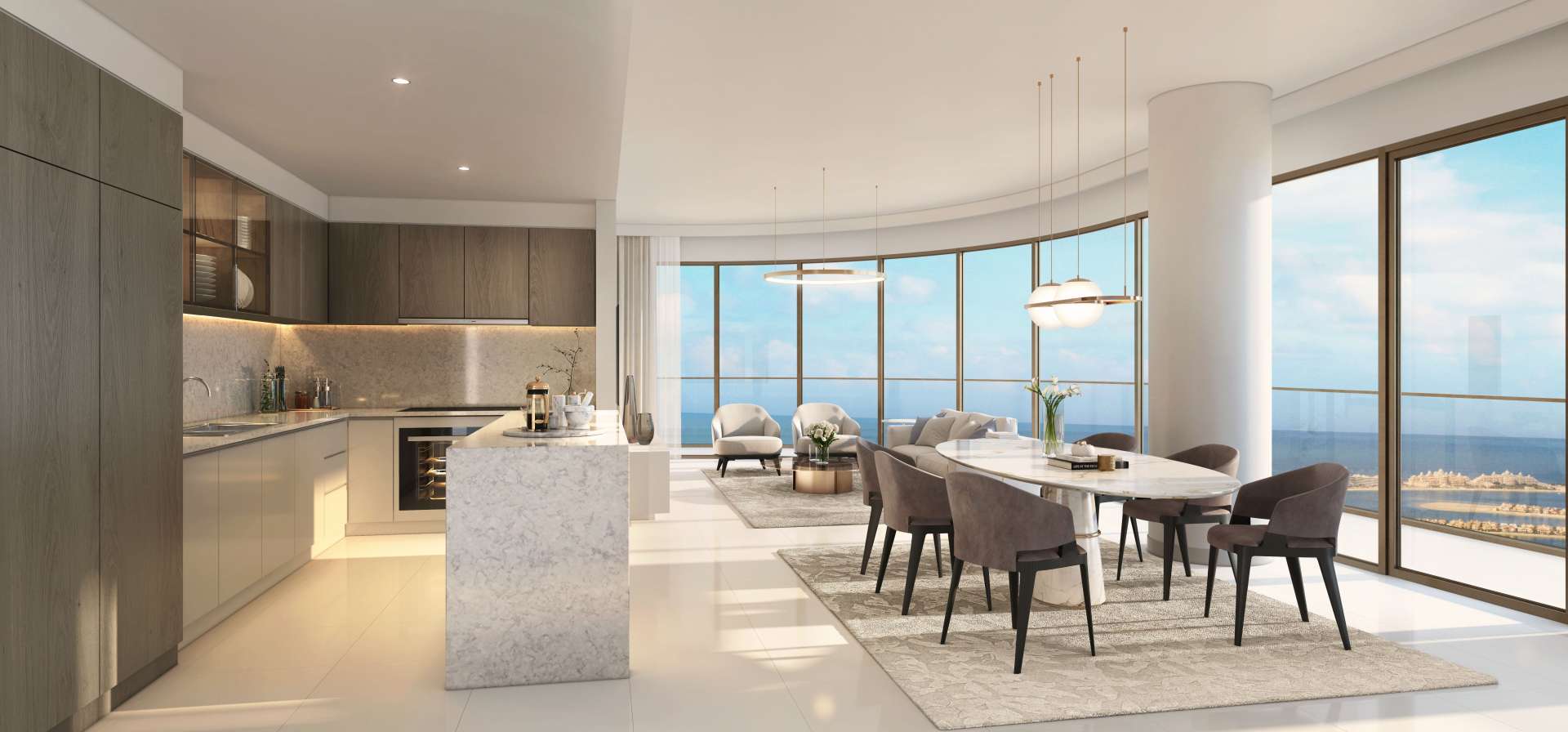 Inside, you get an open space as soon as you step through. Kitchen first, tucked smartly into a corner and actually practical, not just for looks. Fitted cupboards, decent worktops, modern appliances – these are things you'll probably use instead of hide like you do in some glossy show flats. The dining area is close by so it never feels far if you're carrying coffee in the morning or, honestly, just pizza on a weekend. The living room's next, open to everything and lit up by natural sunlight thanks to those full height windows across the way. It just pulls the day in, makes it easy to put your feet up or catch up with a friend. And you know how sometimes a balcony can feel like an afterthought but here it really works – you can just step out and sit with a tea and watch as the sunset colours bounce off the glass below and watch lives happening all around.