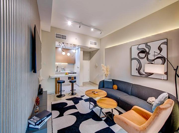 The whole apartment gives off this sense of space. It is seven hundred and twenty eight square feet which is actually spot on if you do not want a huge place with empty rooms and weird corners. Nothing about it feels cramped and the layout just makes sense. The living area flows into the dining space which flows into a proper kitchen the way it should. I really noticed the kitchen more than I expected to because it is not just for show. This is where you could actually cook a proper dinner for friends even try out some family recipes and it feels like everything fits. The appliances are built in and just work with the space rather than against it and all those clever cupboards mean there's somewhere to put everything away. Not a bunch of junk cluttering the counters. It is the kind of kitchen where you can imagine making coffee in the morning with the window open a little and just listening to the city wake up below.