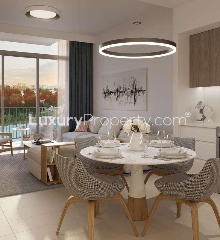 Some homes just have a certain energy as soon as you walk in. That is what happened with this one bedroom apartment in Park Ridge over at Dubai Hills Estate. I did not expect to slow down much that day but the morning light coming in from those big windows pulled me toward the living room and I just sort of stood there for a second. Out the window you see Dubai Hills' long stretch of green and the wide boulevard. You will sometimes catch kids running around on the garden paths or people hanging out on benches with their coffee. There is this calm drifting through the space that almost makes you forget you are really close to the centre of Dubai.