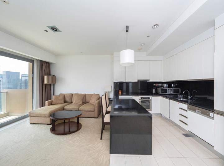 The apartment is fully furnished and honestly it just feels easy. Clean lines not too fussy but still stylish if that makes sense. You sit down here and immediately picture yourself unwinding after a normal Dubai day. The bedroom gets great light in the mornings and there is a calmness that comes with actually having space to stretch out but still feel cozy. I can see someone working from home here or just binge watching a series with the balcony door cracked open. It is fully set up for whatever you like. The WiFi is already sorted so no hassle there at all. The kitchen looks like a place someone might actually cook. Not just heat things up but maybe have slow breakfasts on weekends. There is plenty of room on the counters so you never feel cramped when you are trying to make a coffee or just lay out a pizza.