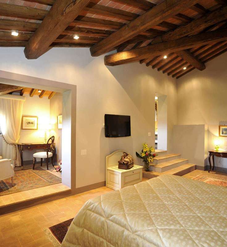 There is something about the red brick on this villa that changes as the day moves—when the sun starts dipping everything glows, and those oak beams peeking through the old terracotta ceilings start showing off their history. Every bit of this Siena villa feels like it's been part of the land for a long time but with the kind of restoration that keeps it honest. The old staircases have loads of character but someone had the good sense to add an elevator so you do not have to worry about climbing all the time. I remember standing at the entryway, just sort of drifting through that big sitting area, getting lost in the views out to the gardens. You just imagine what it would be like to relax here, maybe host a handful of close friends or keep things running as a boutique hotel—honestly, it works either way and both would be special.