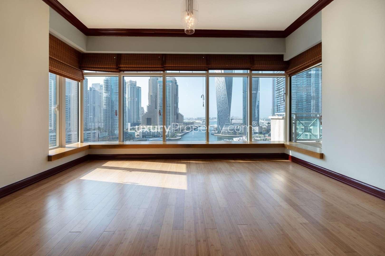 Some places just have that easy feeling when you walk in. This three bedroom apartment in Al Anbar Tower, right in the heart of Dubai Marina, gives exactly that. I found myself just standing in front of those huge windows on the eleventh floor, looking out over the boats and the water. You get so much sunlight in here, everything feels bright. Sometimes you even catch a bit of a sea breeze up this high, which is really nice in the afternoons. The views are special. Marina Walk is buzzing down below. People are having coffee, kids are playing, and you just get this sense that life is happening all around you but up here it is quiet.