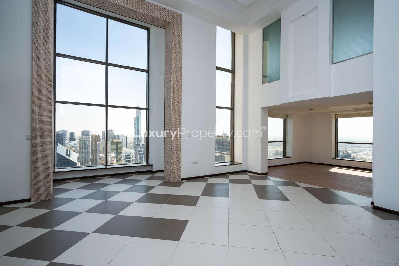 You start in the double height living room which might be my favorite spot in the whole place. The ceilings just keep going up and the windows stretch with them. There is something about standing by the glass where you see the boats moving across the water and the city lighting up in the evening. Kids usually flop down on the big couch or drift up the stairs first. Plenty of grown ups just end up sitting and staring outside quietly for a while. There are not many three bedroom apartments in JBR that come with a private study or bonus room like this one either. It is tucked away and honestly you can use it for anything. Maybe a playroom or a spot to work from home. Some people might even turn it into a mini gym or just a space for hobbies.