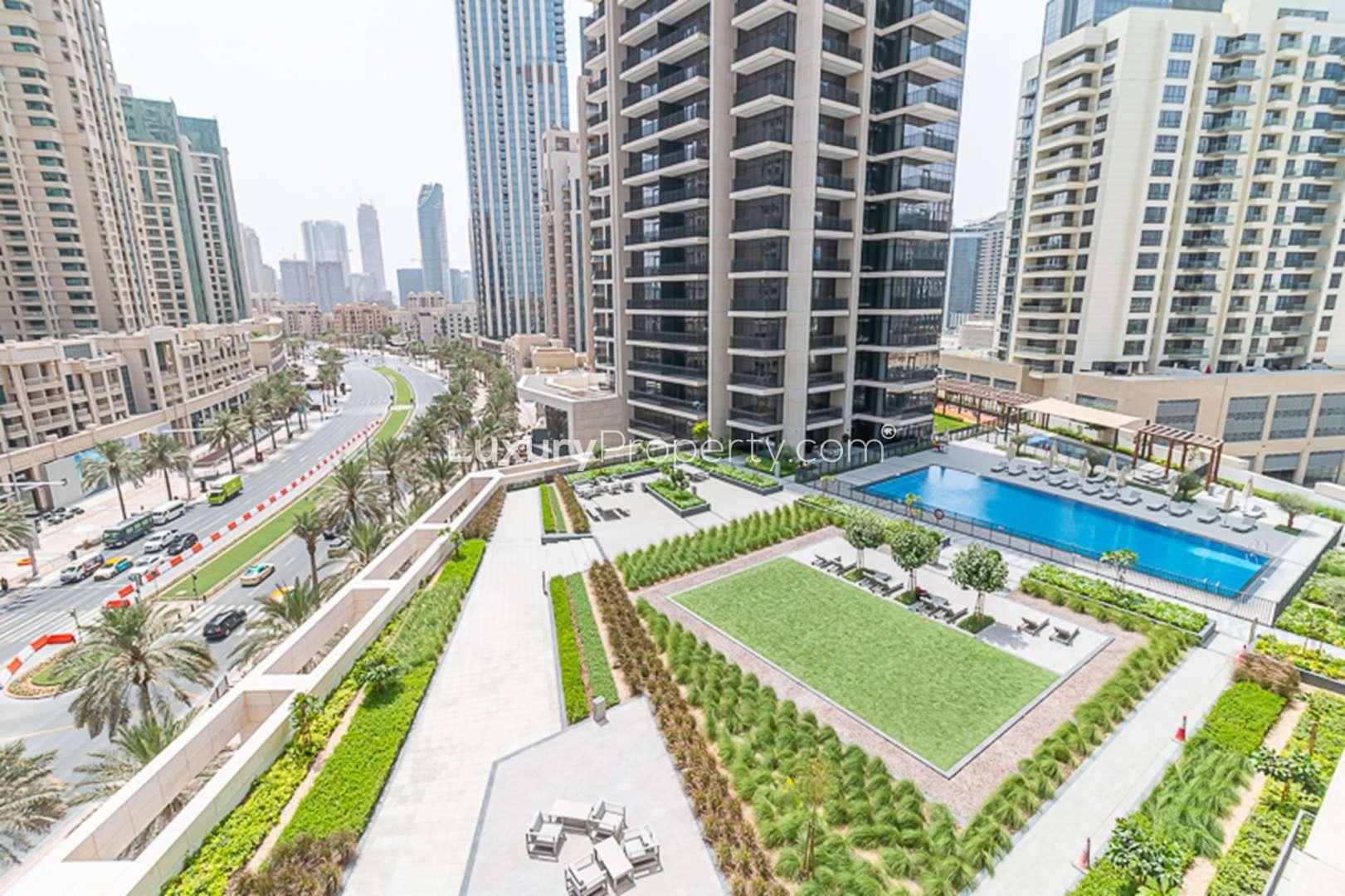 BLVD Crescent itself has got that modern twin tower thing going, right down to the polished lobbies and the landscaped podium with greenery. Every time I have visited, I have seen kids running around the play area and folks reading by the pool. There are actually two swimming pools here. On weekends, you can probably hear people laughing from the water halfway down the corridor. The gym is modern and honestly feels like a place where you would actually work out, not just take photos for Instagram. Downstairs you will find supermarkets, little coffee shops where people hang out, and even a few salons and retail options so life really does feel easy. Evenings get lively along the boulevard with people walking or biking, often with the Burj Khalifa lighting up the sky behind them.