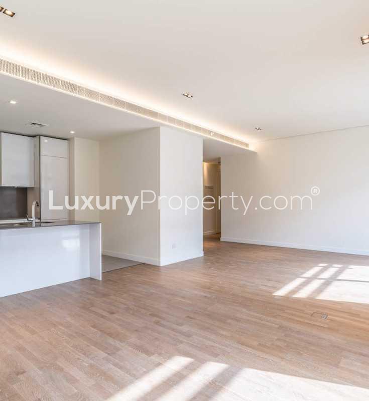 When you walk in everything is bright and open. The living space actually feels like somewhere you want to kick back or have people over without feeling too formal. There is plenty of space. The open plan just makes things easier if you have friends visit or even if it is just a normal weeknight and you want to keep an eye on the kids while you get dinner ready. That kitchen fits right in with the whole look. Not over the top but pretty elegant with room to actually cook and store groceries. You'll notice the color choices are all super soft and neutral but not boring. The wood parquet floor feels warm under your feet. And the best thing is all that floor to ceiling glass that brings in the view and almost pulls the tree lined promenade right into your living room.