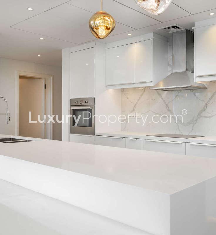If you are curious about the inside, this place is totally upgraded. You get wooden and marble floors that just look great, and they actually feel solid and cool under your feet which is a nice touch during Dubai's warmer days. The kitchen is open not boxed off like some marina apartments and I could honestly see myself making breakfast there without bumping elbows. There are good cabinets and a counter that is the kind where someone can be chatting with you while you cook or help themselves to a snack. If you like proper cooking for real, not just heating up something, this kitchen will make sense to you.