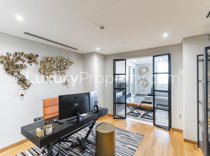 You get these huge floor to ceiling windows all around, so no matter where you are standing in the living room you can see right out over the water. I spent a bit looking at the boats going by and those really open blue views towards Bluewaters and the Dubai skyline. It is one of those living rooms that makes you want to slow down and just sit for a while. Sometimes you can see the sun setting and the water gets this soft glow you will probably want to show off to your friends. The ceilings are tall enough that it never feels cramped. Even with the upgrades and everything freshened up, there is still a feeling of ease here. You can tell the renovations were about making daily life nice not just about showing off.