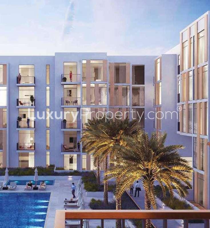 The lobby downstairs is quietly impressive. Neutral colors everywhere, floors that look like they belong in a hotel, and even those crystal chandeliers that give a little sparkle without making anything feel formal. There is this H shaped design to the building, which I never would have thought about before, but it means every single home here has a view worth looking at. Sometimes, you forget you are even in Dubailand with how much nature is outside. At Mudon Views, it is not just about the apartment. Step out to the podium and you can choose to get your feet wet in the pool, or just pad around on those decks. There are courtyard gardens along the edge, where I honestly saw someone stretching after a run, soaking in that evening breeze.