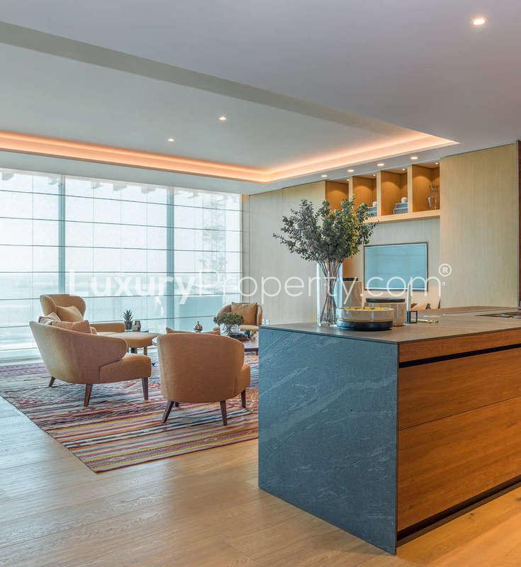 Daylight pours into every corner. You will notice the floor to ceiling windows throughout the apartment which really lifts the mood. The colors inside keep things calm with light shades set off by warm wooden notes and honest stone. It feels quiet and private even though you are right at the heart of the Palm. Sometimes these apartments can feel cold but here you just get a sense of comfort and maybe even a bit of character.