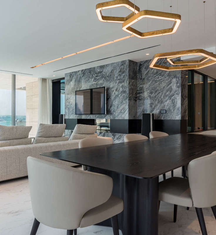Inside, you can feel why this is considered one of the signature properties at Palme Couture. The marble floors feel smooth under your feet especially in summer when you want everything cool and the walls are proper stone not just fancy wallpaper. Everywhere you look there is attention to detail but nothing feels overdone. The cabinetry in the kitchen is top stuff by Poliform Varenna so if you care even a little about cooking or hosting, you will appreciate that. And you do not have to pretend you would cook hereโthe kitchen feels like a place where you would mess up some breakfast or pour a coffee without worrying about leaving a mark. It is black and white and very clean looking but it actually works as a real kitchen.