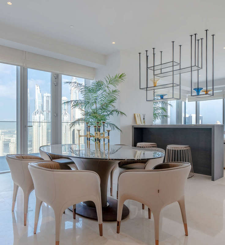 When you walk through, you notice right away how everything is open but still warm. The living space feels wide with these full length windows and some mornings you get this golden sunlight stretching across. I stood by the corner once and honestly just watched the city outside for a while. You really see how those unique glass pods work their magic giving you full top to bottom views that just do not happen in most Dubai apartments. The kitchen actually feels like somewhere you would want to cook for real. It has those modern quartz countertops that invite you to spread out groceries and not just heat up something quick. The cabinetry has a depth and sheen to it with glass and warm wood showing that someone really thought through the details here and did not just fill it with cookie cutter finishes.