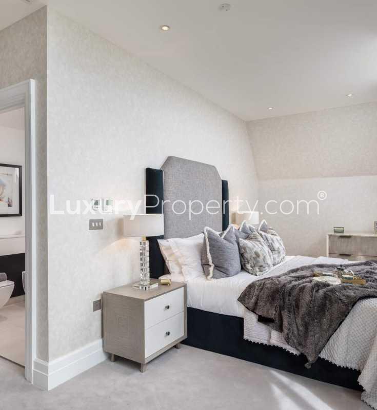 Head up to the third level and that's where you find the master bedroom. Honestly, it feels good up here. The walk in closet is bigger than you would expect in a London apartment and for once it is big enough that you might actually keep it tidy. Light comes in from the right direction and the textures just feel spot on—soft fabrics next to hard surfaces, which somehow just works. The master bath brings that bit of quiet luxury. Those Villeroy and Boch fittings are smooth to the touch and there's no showiness about it, just comfort.