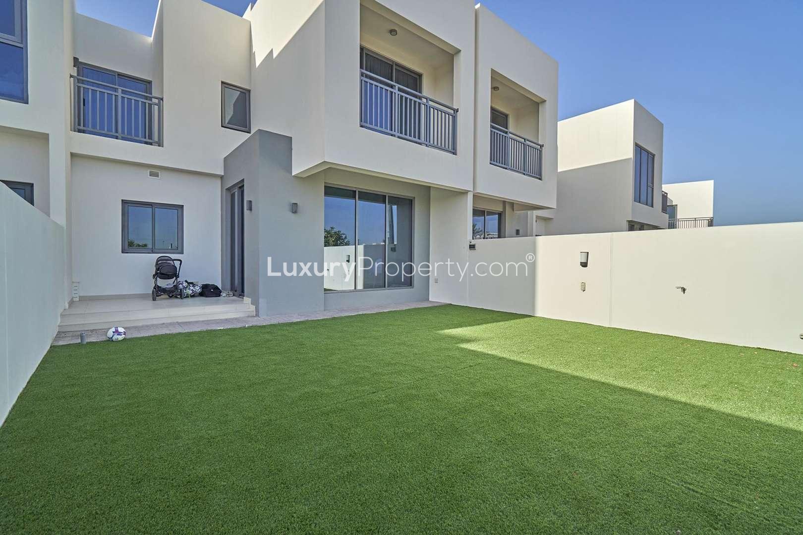 The open plan living space almost invites you to put your feet up or start thinking about what you might cook for dinner. The kitchen does not feel like a showpiece you just look at. Honestly it feels like somewhere you would actually make breakfast while everyone else wakes up a little slowly around you. With the big windows that stretch along one side the whole area always seems bright even on a cloudier day which is rare in Dubai but does happen sometimes. A lot of times you will catch a glimpse of the garden from inside and it sort of does make you want to get out there and just sit with a coffee.