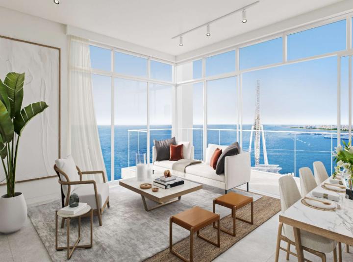 Bluewaters Bay is one of those Dubai communities that people seek out for a reason. You get the skyline ahead of you and the Arabian Gulf stretching out all around. When you step inside, you will see the open plan kitchen that actually feels like the sort of place where someone cooks real meals, not just somewhere you dump takeaways. The appliances are all built in and modern so things work when you need them and there is way more storage than you would expect. The counter faces the dining and living area so it is all one open flow. It makes a difference when friends come by or you just want to keep an eye on the view while you are stirring something.