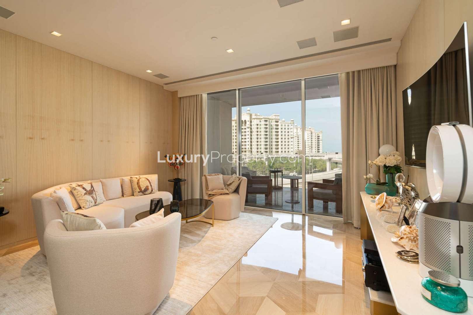 Some homes feel like they just get it right straight away and it honestly surprised me how quickly I felt at home here at this two bedroom apartment in FIVE Palm Jumeirah. Maybe it is the little bit of hustle you hear in the distance mixed with the sound of water or maybe it is just the way the light moves through these rooms as the day goes on. Either way I paused for a while in the living room just to soak up the views. You can actually see the full sweep of the Dubai Marina skyline and there are moments when that blue sea seems to come right up to your window.