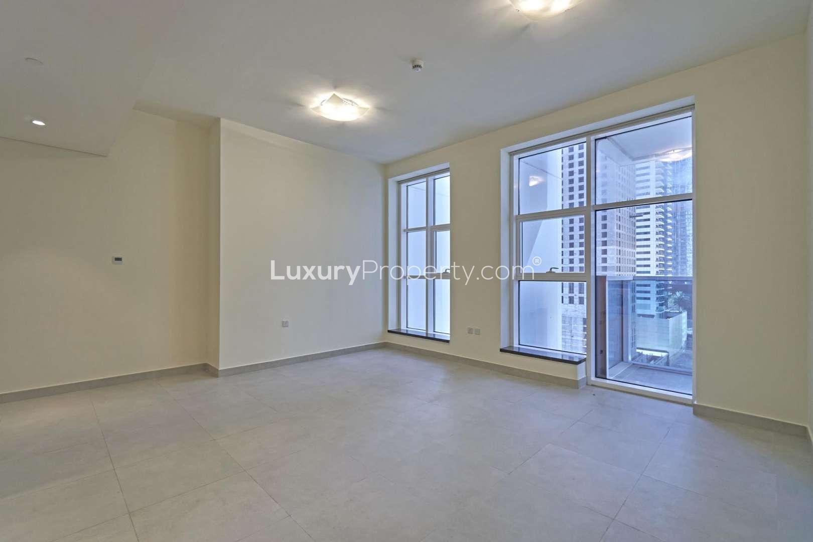 Back in the apartment, there is a real sense of space. Two decent bedrooms, both with fitted wardrobes that actually have proper hanging room—it is not just for show. The bathrooms are clean and modern, and having that second and a half bath just makes it a lot easier when guests come over, no one has to queue for a shower. The mornings feel easy here, sunlight just spills in, especially if you are standing on the balcony with your first coffee. The balcony looks right out toward Damac Heights and Marina Gate so you get that signature Dubai skyline, all those bold glass towers. In the evenings you can see the lights come on across the city and it feels pretty special.