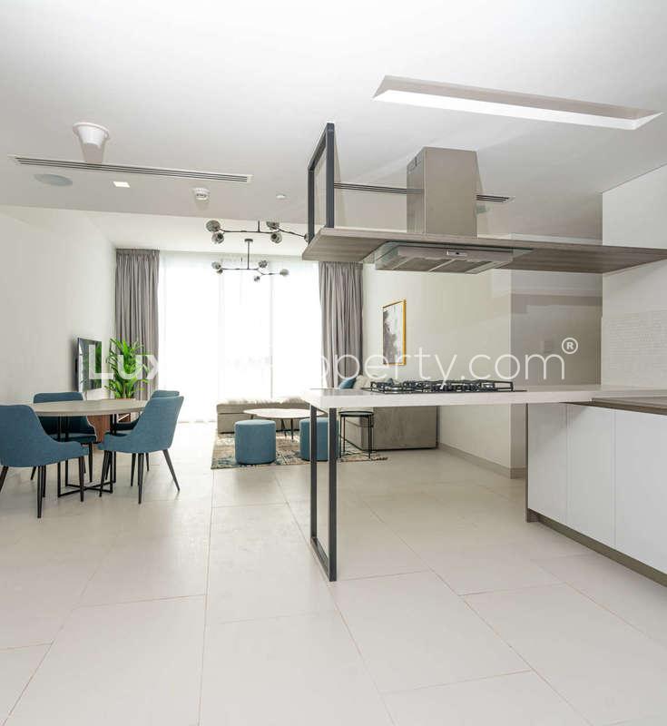 So here's what you get. The whole apartment is laid out in a way that works for day to day life, not just show. You walk in to a living room that feels open but also has these little corners where you can imagine getting comfortable. There's enough space for a good size dining table if you love having people for dinner. The kitchen actually feels like somewhere you'd cook for real, not just heat a takeaway. The breakfast counter is a spot where I can picture you having coffee in the morning, maybe before the rest of the Palm is awake. Sometimes you get tired of closed off spaces but here it just feels easy.