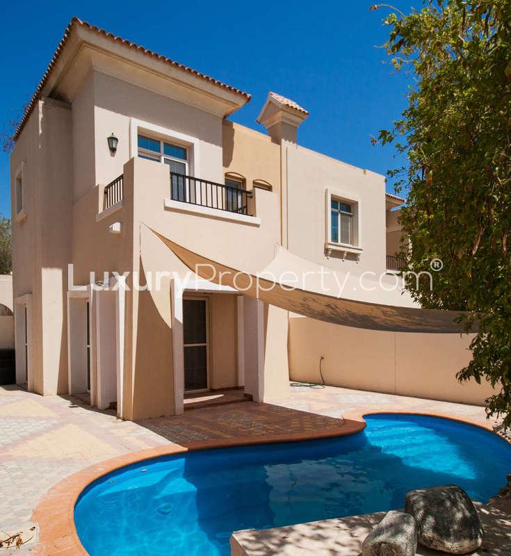 When you step outside you get that sense that the house is really part of the Arabian Ranches lifestyle. The pool is not just a square hole in the ground either. It's got these water features and it's actually big enough that you can swim a few lengths or splash around with kids or friends. Sometimes in the evenings after work it's just nice to dip your feet in and unwind. To the side of the house there's a paved area that fits outdoor seating well. You could imagine barbecue get togethers or even just playing cards with some close friends as the day cools down. Families will notice it's also the right size for a play set or even a little herb garden if you feel like getting your hands dirty.