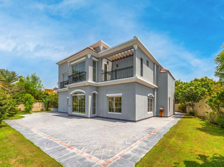 Some homes slow you down before you have even finished walking in. I felt that with this five bedroom villa in Mirador here in Arabian Ranches. Quiet little cul de sacs do something special to a place I think just the way you can hear the birds more or see the neighbor's dogs trotting by in the evenings. You walk up the drive and you just get that sense of space before anything else. The plot here is big you notice it right away out front but also along the side yard where the breeze gets in and you can almost see kids running after each other or maybe a lazy barbecue with everyone spilling out from the patio. No pool yet but the land lets you dream a bit and the reality is you could put in a really good sized one if you wanted or just enjoy more garden for now.