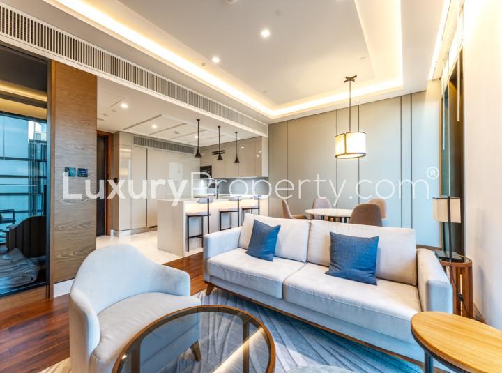 So this is Caesars Bluewaters Dubai. Pretty easy to get to but once you are on the island it is kind of its own little world. I always like walking over the pedestrian bridge, especially just before sunset when the views of Marina and Ain Dubai start glowing. You might have your own car, but honestly I have seen people getting in and out on bikes or even from the boats, and there is good parking too if you drive. The apartment itself is finished in that modern but not cold style, with solid wooden flooring and some soft metal edges that are never too much. The kitchen looks like it is actually there to be used, not just for show. All the appliances are ready for you, and the dining area is open so you can actually host a few friends or eat a takeaway on the couch if you want.