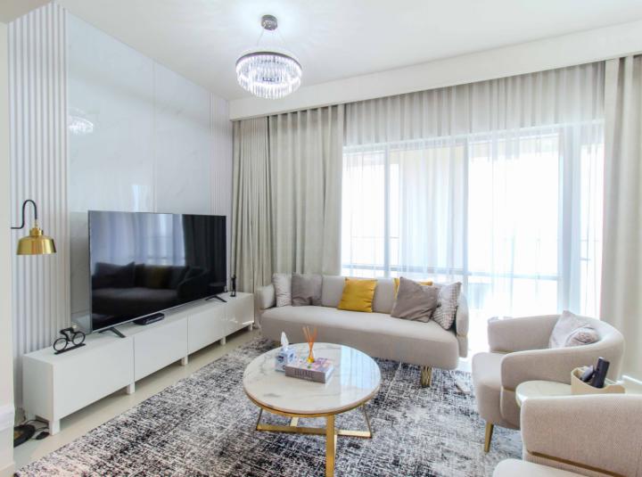 To me the living area is the best kind of open plan because it actually works. It is not awkward. There are no weird angles where you struggle to fit a sofa or find space for a TV. The energy is easygoing and you feel like you can actually host friends or just sprawl out quietly with a book. The balcony off the living room is one of those little escapes. Coffee just tastes better out there in the late afternoon. Sometimes you catch the breeze and hear a bit of city life three stories below but it is not noisy. Sometimes you spot kids biking or people heading down to the promenade for an evening walk. It is peaceful in a way you do not always expect in Dubai.