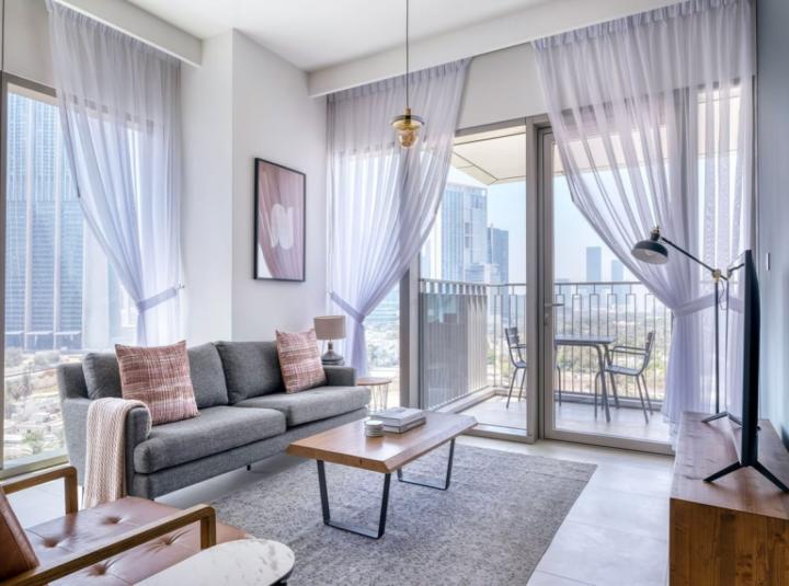 You start to get a sense of the space even before you open the door. The building itself has this inviting energy, people coming and going with shopping bags or coffee in hand. Sometimes you can hear the soft footsteps echoing in the corridor and honestly, it just feels welcoming. As soon as you enter the apartment, all that city noise is replaced by soft natural light pouring through full height windows. Standing by the living room window, you get this panoramic view across Downtown Dubai with the Burj Khalifa in one direction and the Dubai Fountain sparkling down below. It changes with the time of day. In the mornings when I visited, the light was cool and gentle, and by evening, the skyline starts to glow a little. You notice things like clouds rolling past the tip of the Burj or the occasional airplane weaving its way out of the city.