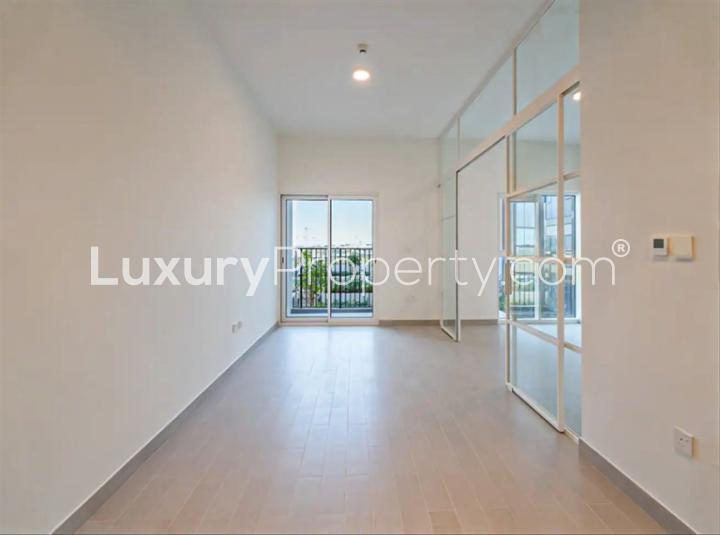 Some homes simply slow you down right at the door. This two bedroom apartment in Golfville, Dubai Hills Estate, does exactly that. The air feels different when you walk in and every window seems to catch the city in a different mood. I have stood by the living room balcony just watching the sun shift over the Burj Khalifa in the distance. It just pulls you in for a second because honestly you do not get these skyline views often, at least not like this.