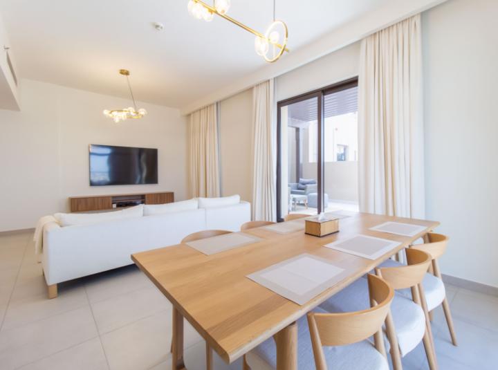 Some homes make you feel welcome even before you really step inside and that is exactly what happens with this three bedroom apartment in Madinat Jumeirah Living. I walked through the main doors and just felt that sense of calm right away. It is set right in Umm Suqeim which is always nice because you get those old Dubai touches but at the same time it feels tucked away from all that city rush. You can almost hear the difference when you leave the main road and come closer to these quiet streets. What caught my eye first were the big windows in the living room letting in all this daylight and honestly it changes the whole atmosphere. Stand there for a moment and suddenly you get how the light travels across the floor from morning until dusk. I ended up just watching the city coming alive through the glass for a bit because the views can be hard to turn away from.