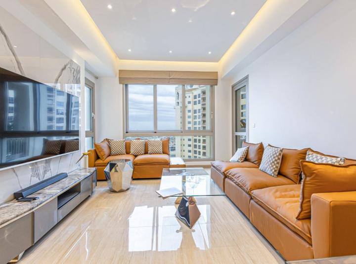 This apartment is unfurnished so you get to make it yours from day one. The layout is actually more generous than I expected especially with the raised ceilings. It just gives the space room to breathe you will notice it as soon as you step inside. The main living space has this Travertine stone flooring that always feels cool and solid underfoot the kind of floor you do not worry about you just live in it. There is a custom TV wall so you do not end up trying to organize wires everywhere. I stood by the window there for a bit and got this sense of quiet even with the city nearby.