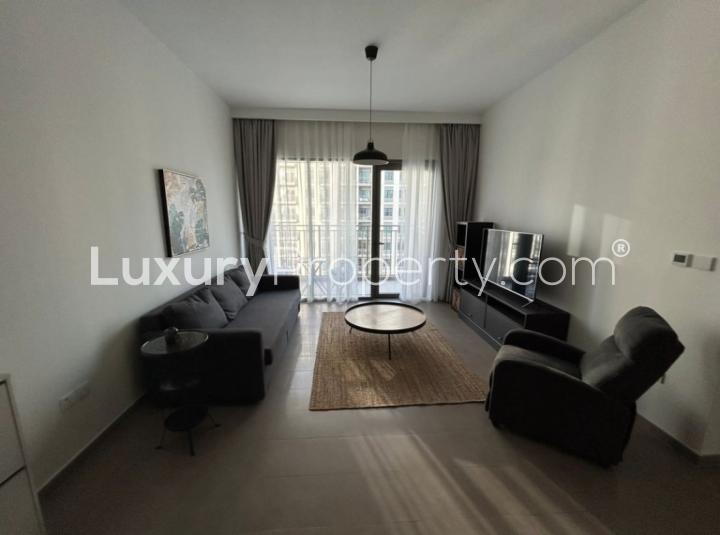 Some places just let you breathe the moment you step in. That is what happened when I first walked into this furnished one bedroom apartment at Park Heights in Dubai Hills Estate. Honestly I did not expect to linger by the entry but something about that high up view with the city stretching out below made me want to stay right there for a minute and just look. You get all this natural light spilling through the big windows and landing gently on a setup that is both stylish and real. Nothing too perfect or staged. It actually feels lived in even though it is vacant and ready for its next person.
