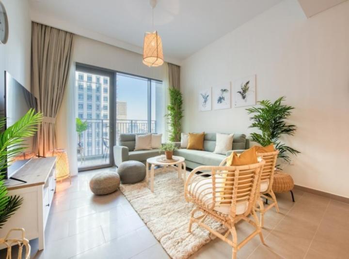 The living area is just easygoing. You have your space to stretch out or invite friends over and not worry about it feeling crowded. The apartment is furnished already and I will be honest the furniture is comfortable. Not just there to fill space but actually the kind of sofa you would flop down on after work. I remember sitting at the dining table for a while and you could see yourself working there or having dinner without feeling boxed in. The kitchen is right in the flow of things too so everything is connected. If you love to cook you will notice the appliances are all top quality used but not worn out and if you just want to toss something quick together it is still simple. The counter does not fill up with clutter either because there is enough storage built in and that is rare in a lot of Dubai apartments.