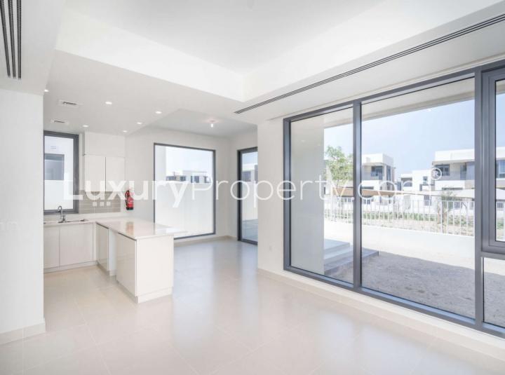 Some homes just make you breathe a little slower the second you walk in and this five bedroom townhouse in Maple at Dubai Hills Estate is really one of those. I remember standing near the front door for a moment before stepping all the way inside because it just felt inviting in a way you might not expect from a modern Dubai townhouse. Things feel open and pretty easy going right from the start. The living room is set where the light comes in best in the morning and if you stand by the wide window you can see little bits of the garden that actually wraps the whole way around. I could just picture people sitting outside with a coffee or maybe some kids rolling a ball across the lawn and laughing so loudly you hear them even through the glass.