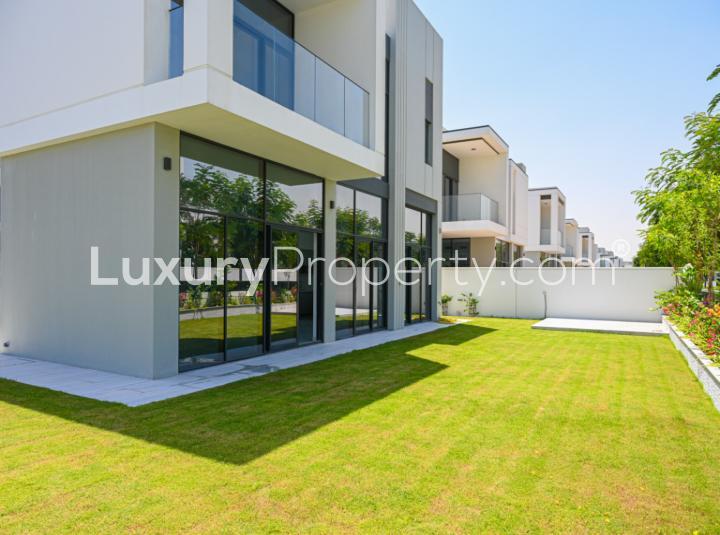 Some homes just put you at ease right from the start. This five bedroom villa in Murooj Al Furjan has that calm kind of atmosphere where you walk in and things just slow down a little. I remember stepping inside and the sunlight was pouring through those big floor to ceiling windows. The garden outside actually looked alive with all the natural grass and even a small water feature bubbling along. You can picture kids running around barefoot out there or maybe even just sitting out with a morning coffee while the world wakes up.